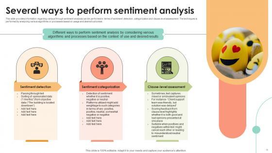 This slide provides information regarding various through sentiment analysis can be performed in terms of sentiment detection, categorization and clause-level assessment. The techniques is performed by analyzing various algorithms or processes based on usage and desired outcomes. If your project calls for a presentation, then Slidegeeks is your go-to partner because we have professionally designed, easy-to-edit templates that are perfect for any presentation. After downloading, you can easily edit Several Ways To Perform Sentiment Analysis Decoding User Emotions In Depth Exploration AI SS V and make the changes accordingly. You can rearrange slides or fill them with different images. Check out all the handy templates This slide provides information regarding various through sentiment analysis can be performed in terms of sentiment detection, categorization and clause-level assessment. The techniques is performed by analyzing various algorithms or processes based on usage and desired outcomes.