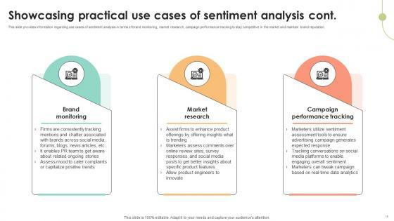 This slide provides information regarding use cases of sentiment analysis in terms of social media tracking, competitive research, enhanced customer service and marketing messages to end user for engagement or retention. If you are looking for a format to display your unique thoughts, then the professionally designed Showcasing Practical Use Cases Of Decoding User Emotions In Depth Exploration AI SS V is the one for you. You can use it as a Google Slides template or a PowerPoint template. Incorporate impressive visuals, symbols, images, and other charts. Modify or reorganize the text boxes as you desire. Experiment with shade schemes and font pairings. Alter, share or cooperate with other people on your work. Download Showcasing Practical Use Cases Of Decoding User Emotions In Depth Exploration AI SS V and find out how to give a successful presentation. Present a perfect display to your team and make your presentation unforgettable. This slide provides information regarding use cases of sentiment analysis in terms of social media tracking, competitive research, enhanced customer service and marketing messages to end user for engagement or retention.