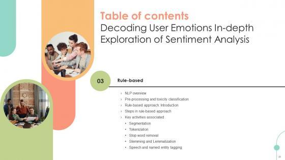 This slide provides information regarding rule-based approach that helps in detection, classification, and scoring certain keywords based on pre-defined lexicons. It helps in identifying positive, negative or neutral sentiment across content. Do you have an important presentation coming up Are you looking for something that will make your presentation stand out from the rest Look no further than Rule Based Approach For Sentiment Analysis Decoding User Emotions In Depth Exploration AI SS V. With our professional designs, you can trust that your presentation will pop and make delivering it a smooth process. And with Slidegeeks, you can trust that your presentation will be unique and memorable. So why wait Grab Rule Based Approach For Sentiment Analysis Decoding User Emotions In Depth Exploration AI SS V today and make your presentation stand out from the rest This slide provides information regarding rule-based approach that helps in detection, classification, and scoring certain keywords based on pre-defined lexicons. It helps in identifying positive, negative or neutral sentiment across content.