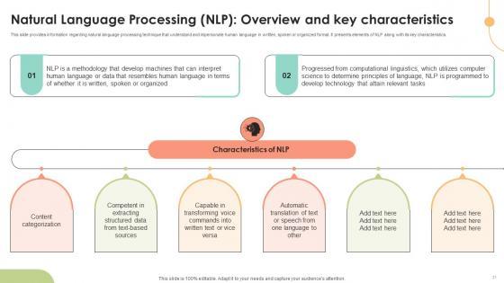 This slide provides information regarding natural language processing technique that understand and impersonate human language in written, spoken or organized format. It presents elements of NLP along with its key characteristics. Boost your pitch with our creative Natural Language Processing NLP Decoding User Emotions In Depth Exploration AI SS V. Deliver an awe-inspiring pitch that will mesmerize everyone. Using these presentation templates you will surely catch everyones attention. You can browse the ppts collection on our website. We have researchers who are experts at creating the right content for the templates. So you do not have to invest time in any additional work. Just grab the template now and use them. This slide provides information regarding natural language processing technique that understand and impersonate human language in written, spoken or organized format. It presents elements of NLP along with its key characteristics.