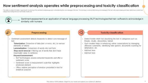 This slide provides information regarding the functioning of the sentiment analysis approach while detecting the core message of the text. The technique works by determining core message of the text with preprocessing and it also detect toxic content and categorizes it categories such as threats, insults, etc. The How Sentiment Analysis Operates While Decoding User Emotions In Depth Exploration AI SS V is a compilation of the most recent design trends as a series of slides. It is suitable for any subject or industry presentation, containing attractive visuals and photo spots for businesses to clearly express their messages. This template contains a variety of slides for the user to input data, such as structures to contrast two elements, bullet points, and slides for written information. Slidegeeks is prepared to create an impression. This slide provides information regarding the functioning of the sentiment analysis approach while detecting the core message of the text. The technique works by determining core message of the text with preprocessing and it also detect toxic content and categorizes it categories such as threats, insults, etc.