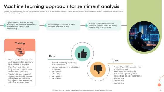This slide provides information regarding machine learning approach for performing sentiment analysis. It helps in determining hidden sentiments across content. It highlights about the training with ML-based technique along with pros and cons. This Machine Learning Approach For Sentiment Decoding User Emotions In Depth Exploration AI SS V from Slidegeeks makes it easy to present information on your topic with precision. It provides customization options, so you can make changes to the colors, design, graphics, or any other component to create a unique layout. It is also available for immediate download, so you can begin using it right away. Slidegeeks has done good research to ensure that you have everything you need to make your presentation stand out. Make a name out there for a brilliant performance. This slide provides information regarding machine learning approach for performing sentiment analysis. It helps in determining hidden sentiments across content. It highlights about the training with ML-based technique along with pros and cons.