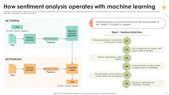 This slide provides information regarding the functioning of sentiment analysis techniques with machine learning to assess the polarity of text and whether the sense of text is positive or negative. It includes feature extraction technique which includes tokenization, lemmatization, and stop-word removal. Are you searching for a How Sentiment Analysis Operates With Decoding User Emotions In Depth Exploration AI SS V that is uncluttered, straightforward, and original Its easy to edit, and you can change the colors to suit your personal or business branding. For a presentation that expresses how much effort you have put in, this template is ideal With all of its features, including tables, diagrams, statistics, and lists, its perfect for a business plan presentation. Make your ideas more appealing with these professional slides. Download How Sentiment Analysis Operates With Decoding User Emotions In Depth Exploration AI SS V from Slidegeeks today. This slide provides information regarding the functioning of sentiment analysis techniques with machine learning to assess the polarity of text and whether the sense of text is positive or negative. It includes feature extraction technique which includes tokenization, lemmatization, and stop-word removal.
