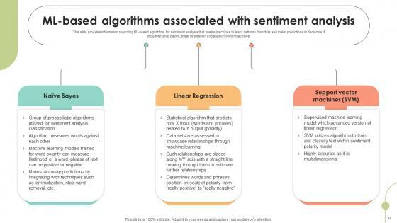 This slide provides information regarding ML-based algorithms for sentiment analysis that enable machines to learn patterns from data and make predictions or decisions. It includes Naive Bayes, linear regression and support vector machines. Do you know about Slidesgeeks ML Based Algorithms Associated With Decoding User Emotions In Depth Exploration AI SS V These are perfect for delivering any kind od presentation. Using it, create PowerPoint presentations that communicate your ideas and engage audiences. Save time and effort by using our pre-designed presentation templates that are perfect for a wide range of topic. Our vast selection of designs covers a range of styles, from creative to business, and are all highly customizable and easy to edit. Download as a PowerPoint template or use them as Google Slides themes. This slide provides information regarding ML-based algorithms for sentiment analysis that enable machines to learn patterns from data and make predictions or decisions. It includes Naive Bayes, linear regression and support vector machines.