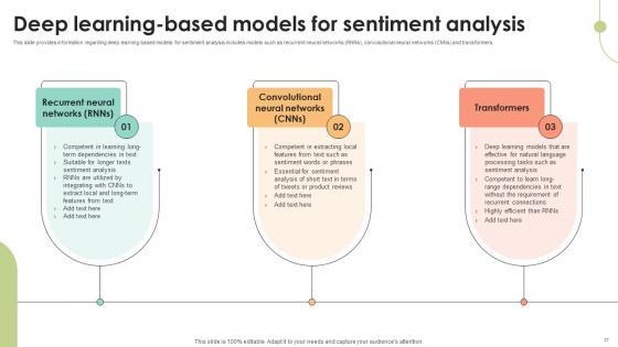 This slide provides information regarding deep learning based models for sentiment analysis includes models such as recurrent neural networks RNNs, convolutional neural networks CNNs and transformers. Crafting an eye-catching presentation has never been more straightforward. Let your presentation shine with this tasteful yet straightforward Deep Learning Based Models For Sentiment Decoding User Emotions In Depth Exploration AI SS V template. It offers a minimalistic and classy look that is great for making a statement. The colors have been employed intelligently to add a bit of playfulness while still remaining professional. Construct the ideal Deep Learning Based Models For Sentiment Decoding User Emotions In Depth Exploration AI SS V that effortlessly grabs the attention of your audience Begin now and be certain to wow your customers This slide provides information regarding deep learning based models for sentiment analysis includes models such as recurrent neural networks RNNs, convolutional neural networks CNNs and transformers.