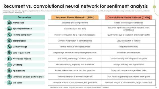 This slide provides information regarding comparative analysis of recurrent and convolutional neural network for sentiment analysis on various parameters such as architecture, input representation, training complexity, data requirements, pre-trained models, overfitting, applications, etc. Present like a pro with Recurrent Vs Convolutional Neural Decoding User Emotions In Depth Exploration AI SS V. Create beautiful presentations together with your team, using our easy-to-use presentation slides. Share your ideas in real-time and make changes on the fly by downloading our templates. So whether you are in the office, on the go, or in a remote location, you can stay in sync with your team and present your ideas with confidence. With Slidegeeks presentation got a whole lot easier. Grab these presentations today. This slide provides information regarding comparative analysis of recurrent and convolutional neural network for sentiment analysis on various parameters such as architecture, input representation, training complexity, data requirements, pre-trained models, overfitting, applications, etc.