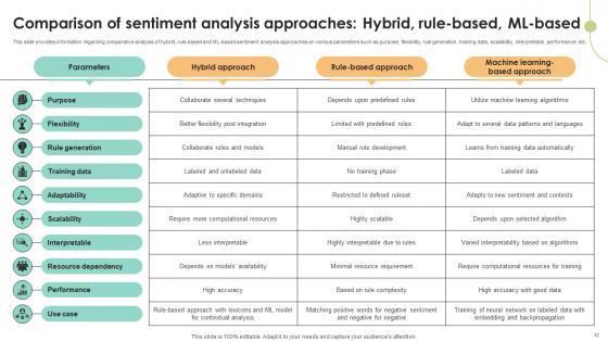 This slide provides information regarding comparative analysis of hybrid, rule-based and ML-based sentiment analysis approaches on various parameters such as purpose, flexibility, rule generation, training data, scalability, interpretable, performance, etc. Present like a pro with Comparison Of Sentiment Analysis Approaches Decoding User Emotions In Depth Exploration AI SS V. Create beautiful presentations together with your team, using our easy-to-use presentation slides. Share your ideas in real-time and make changes on the fly by downloading our templates. So whether you are in the office, on the go, or in a remote location, you can stay in sync with your team and present your ideas with confidence. With Slidegeeks presentation got a whole lot easier. Grab these presentations today. This slide provides information regarding comparative analysis of hybrid, rule-based and ML-based sentiment analysis approaches on various parameters such as purpose, flexibility, rule generation, training data, scalability, interpretable, performance, etc.