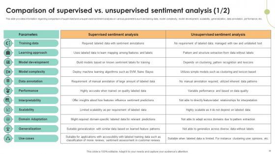 This slide provides information regarding comparison of supervised and unsupervised sentiment analysis on various parameters such as training data, model complexity, model development, scalability, generalization, data annotation, performance, etc. Slidegeeks is here to make your presentations a breeze with Comparison Of Supervised Vs Unsupervised Decoding User Emotions In Depth Exploration AI SS V With our easy-to-use and customizable templates, you can focus on delivering your ideas rather than worrying about formatting. With a variety of designs to choose from, you are sure to find one that suits your needs. And with animations and unique photos, illustrations, and fonts, you can make your presentation pop. So whether you are giving a sales pitch or presenting to the board, make sure to check out Slidegeeks first This slide provides information regarding comparison of supervised and unsupervised sentiment analysis on various parameters such as training data, model complexity, model development, scalability, generalization, data annotation, performance, etc.