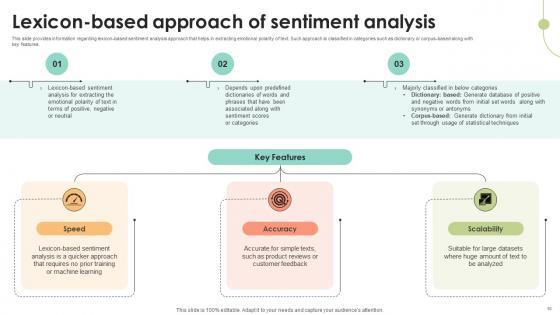 This slide provides information regarding lexicon-based sentiment analysis approach that helps in extracting emotional polarity of text. Such approach is classified in categories such as dictionary or corpus-based along with key features. Here you can discover an assortment of the finest PowerPoint and Google Slides templates. With these templates, you can create presentations for a variety of purposes while simultaneously providing your audience with an eye-catching visual experience. Download Lexicon Based Approach Of Sentiment Decoding User Emotions In Depth Exploration AI SS V to deliver an impeccable presentation. These templates will make your job of preparing presentations much quicker, yet still, maintain a high level of quality. Slidegeeks has experienced researchers who prepare these templates and write high-quality content for you. Later on, you can personalize the content by editing the Lexicon Based Approach Of Sentiment Decoding User Emotions In Depth Exploration AI SS V. This slide provides information regarding lexicon-based sentiment analysis approach that helps in extracting emotional polarity of text. Such approach is classified in categories such as dictionary or corpus-based along with key features.