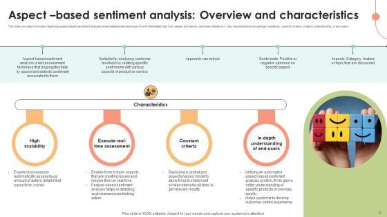 This slide provides information regarding aspect-based sentiment analysis is text-assessment technique that differentiates data from aspect and identify sentiment related to it. Key characteristics include high scalability, constant criteria, in-depth understanding of end-users. Create an editable Aspect Based Sentiment Analysis Overview Decoding User Emotions In Depth Exploration AI SS V that communicates your idea and engages your audience. Whether you are presenting a business or an educational presentation, pre-designed presentation templates help save time. Aspect Based Sentiment Analysis Overview Decoding User Emotions In Depth Exploration AI SS V is highly customizable and very easy to edit, covering many different styles from creative to business presentations. Slidegeeks has creative team members who have crafted amazing templates. So, go and get them without any delay. This slide provides information regarding aspect-based sentiment analysis is text-assessment technique that differentiates data from aspect and identify sentiment related to it. Key characteristics include high scalability, constant criteria, in-depth understanding of end-users.
