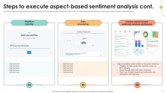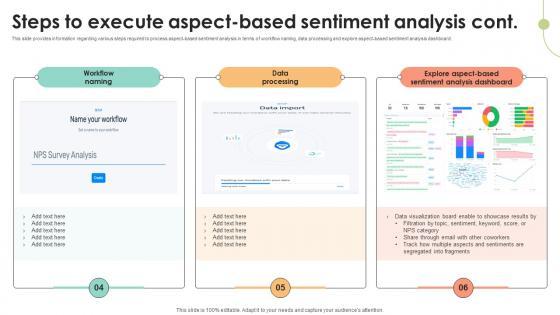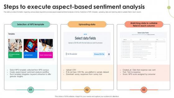 This slide provides information regarding various steps required to process aspect-based sentiment analysis in terms of selection of NPS template, uploading data and matching data to suitable field in each column. Are you in need of a template that can accommodate all of your creative concepts This one is crafted professionally and can be altered to fit any style. Use it with Google Slides or PowerPoint. Include striking photographs, symbols, depictions, and other visuals. Fill, move around, or remove text boxes as desired. Test out color palettes and font mixtures. Edit and save your work, or work with colleagues. Download Steps To Execute Aspect Based Sentiment Decoding User Emotions In Depth Exploration AI SS V and observe how to make your presentation outstanding. Give an impeccable presentation to your group and make your presentation unforgettable. This slide provides information regarding various steps required to process aspect-based sentiment analysis in terms of selection of NPS template, uploading data and matching data to suitable field in each column.