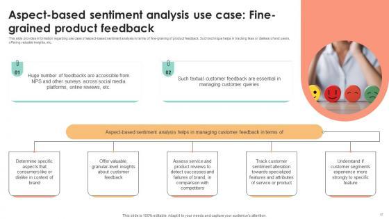 This slide provides information regarding use case of aspect-based sentiment analysis in terms of fine-graining of product feedback. Such technique helps in tracking likes or dislikes of end users, offering valuable insights, etc. Want to ace your presentation in front of a live audience Our Aspect Based Sentiment Analysis Use Decoding User Emotions In Depth Exploration AI SS V can help you do that by engaging all the users towards you. Slidegeeks experts have put their efforts and expertise into creating these impeccable powerpoint presentations so that you can communicate your ideas clearly. Moreover, all the templates are customizable, and easy-to-edit and downloadable. Use these for both personal and commercial use. This slide provides information regarding use case of aspect-based sentiment analysis in terms of fine-graining of product feedback. Such technique helps in tracking likes or dislikes of end users, offering valuable insights, etc.