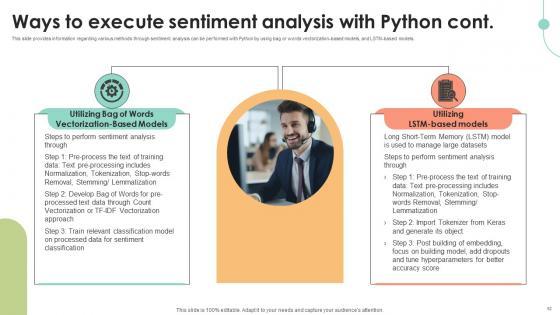 This slide provides information regarding various methods through sentiment analysis can be performed with Python by using Text blob, transformer-based models and VADER. Welcome to our selection of the Ways To Execute Sentiment Analysis Decoding User Emotions In Depth Exploration AI SS V. These are designed to help you showcase your creativity and bring your sphere to life. Planning and Innovation are essential for any business that is just starting out. This collection contains the designs that you need for your everyday presentations. All of our PowerPoints are 100Percent editable, so you can customize them to suit your needs. This multi-purpose template can be used in various situations. Grab these presentation templates today. This slide provides information regarding various methods through sentiment analysis can be performed with Python by using Text blob, transformer-based models and VADER.
