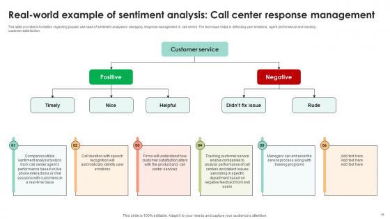 This slide provides information regarding popular use case of sentiment analysis in managing response management in call centre. The technique helps in detecting user emotions, agent performance and tracking customer satisfaction. Slidegeeks is one of the best resources for PowerPoint templates. You can download easily and regulate Real World Example Of Sentiment Analysis Call Decoding User Emotions In Depth Exploration AI SS V for your personal presentations from our wonderful collection. A few clicks is all it takes to discover and get the most relevant and appropriate templates. Use our Templates to add a unique zing and appeal to your presentation and meetings. All the slides are easy to edit and you can use them even for advertisement purposes. This slide provides information regarding popular use case of sentiment analysis in managing response management in call centre. The technique helps in detecting user emotions, agent performance and tracking customer satisfaction.