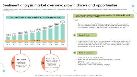 This slide provides information regarding sentiment analysis market insights in terms of market size along with growth rate, prominent players and geographical region capturing largest market size. The market is driven by several growth drivers, market opportunities. Whether you have daily or monthly meetings, a brilliant presentation is necessary. Sentiment Analysis Market Overview Growth Decoding User Emotions In Depth Exploration AI SS V can be your best option for delivering a presentation. Represent everything in detail using Sentiment Analysis Market Overview Growth Decoding User Emotions In Depth Exploration AI SS V and make yourself stand out in meetings. The template is versatile and follows a structure that will cater to your requirements. All the templates prepared by Slidegeeks are easy to download and edit. Our research experts have taken care of the corporate themes as well. So, give it a try and see the results. This slide provides information regarding sentiment analysis market insights in terms of market size along with growth rate, prominent players and geographical region capturing largest market size. The market is driven by several growth drivers, market opportunities.