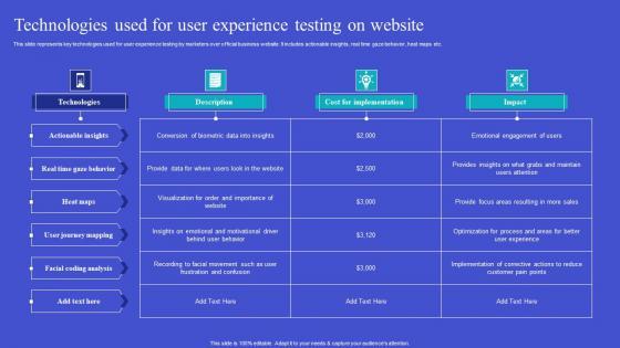 This slide represents key technologies used for user experience testing by marketers over official business website. It includes actionable insights, real time gaze behavior, heat maps etc. Slidegeeks has constructed Exploring Neuromarketing Strategies Technologies Used For User Experience Clipart Pdf after conducting extensive research and examination. These presentation templates are constantly being generated and modified based on user preferences and critiques from editors. Here, you will find the most attractive templates for a range of purposes while taking into account ratings and remarks from users regarding the content. This is an excellent jumping off point to explore our content and will give new users an insight into our top notch PowerPoint Templates. This slide represents key technologies used for user experience testing by marketers over official business website. It includes actionable insights, real time gaze behavior, heat maps etc.