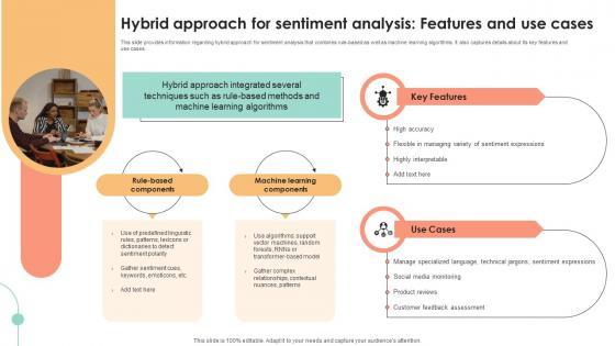 This slide provides information regarding hybrid approach for sentiment analysis that combines rule-based as well as machine learning algorithms. It also captures details about its key features and use cases. Retrieve professionally designed Hybrid Approach For Sentiment Analysis Decoding User Emotions In Depth Exploration AI SS V to effectively convey your message and captivate your listeners. Save time by selecting pre-made slideshows that are appropriate for various topics, from business to educational purposes. These themes come in many different styles, from creative to corporate, and all of them are easily adjustable and can be edited quickly. Access them as PowerPoint templates or as Google Slides themes. You do not have to go on a hunt for the perfect presentation because Slidegeeks got you covered from everywhere. This slide provides information regarding hybrid approach for sentiment analysis that combines rule-based as well as machine learning algorithms. It also captures details about its key features and use cases.