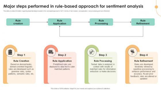 This slide provides information regarding essential steps included in the rule-based approach in NLP in terms of rule creation, rule application, rule processing and rule refinement. Take your projects to the next level with our ultimate collection of Major Steps Performed In Rule Based Decoding User Emotions In Depth Exploration AI SS V. Slidegeeks has designed a range of layouts that are perfect for representing task or activity duration, keeping track of all your deadlines at a glance. Tailor these designs to your exact needs and give them a truly corporate look with your own brand colors they will make your projects stand out from the rest This slide provides information regarding essential steps included in the rule-based approach in NLP in terms of rule creation, rule application, rule processing and rule refinement.