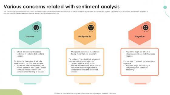 This slide provides information regarding various issues associated with sentiment assessment which can be difficult while analyzing sarcasm, multi-polarity and negation. Despite having such concerns, still sentiment analysis is a powerful tool which helps in assessing customer feedback, and social media monitoring. This modern and well-arranged Various Concerns Related With Sentiment Decoding User Emotions In Depth Exploration AI SS V provides lots of creative possibilities. It is very simple to customize and edit with the Powerpoint Software. Just drag and drop your pictures into the shapes. All facets of this template can be edited with Powerpoint, no extra software is necessary. Add your own material, put your images in the places assigned for them, adjust the colors, and then you can show your slides to the world, with an animated slide included. This slide provides information regarding various issues associated with sentiment assessment which can be difficult while analyzing sarcasm, multi-polarity and negation. Despite having such concerns, still sentiment analysis is a powerful tool which helps in assessing customer feedback, and social media monitoring.