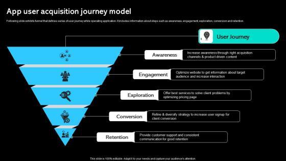 Following slide exhibits funnel that defines series of user journey while operating application. It includes information about steps such as awareness, engagement, exploration, conversion and retention. Welcome to our selection of the App User Acquisition Journey Model Online Customer Acquisition Sample Pdf These are designed to help you showcase your creativity and bring your sphere to life. Planning and Innovation are essential for any business that is just starting out. This collection contains the designs that you need for your everyday presentations. All of our PowerPoints are 100 percent editable, so you can customize them to suit your needs. This multi-purpose template can be used in various situations. Grab these presentation templates today. Following slide exhibits funnel that defines series of user journey while operating application. It includes information about steps such as awareness, engagement, exploration, conversion and retention.