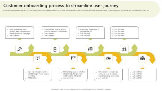 Mentioned slide outlines multistep process that can assist corporates in optimizing customer journey and increase conversion rate. The process begins with brand awareness, welcome email, interaction with brand, etc. Slidegeeks is here to make your presentations a breeze with Customer Onboarding Process To Streamline User Journey Diagrams PDF With our easy to use and customizable templates, you can focus on delivering your ideas rather than worrying about formatting. With a variety of designs to choose from, you are sure to find one that suits your needs. And with animations and unique photos, illustrations, and fonts, you can make your presentation pop. So whether you are giving a sales pitch or presenting to the board, make sure to check out Slidegeeks first.
