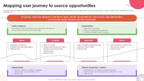 This slide showcases mapping user journey for UX strategy helping companies in identical industries get information about new opportunities. It provides details define, compare, negotiate, select, opportunities, internal ownership, etc.Formulating a presentation can take up a lot of effort and time, so the content and message should always be the primary focus. The visuals of the PowerPoint can enhance the presenters message, so our Mapping User Journey To User Experience Design Ppt Template Strategy SS V was created to help save time. Instead of worrying about the design, the presenter can concentrate on the message while our designers work on creating the ideal templates for whatever situation is needed. Slidegeeks has experts for everything from amazing designs to valuable content, we have put everything into Mapping User Journey To User Experience Design Ppt Template Strategy SS V This slide showcases mapping user journey for UX strategy helping companies in identical industries get information about new opportunities. It provides details define, compare, negotiate, select, opportunities, internal ownership, etc.
