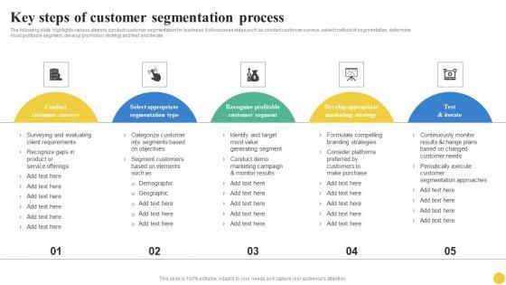 The following slide highlights various steps to conduct customer segmentation for business. It showcases steps such as conduct customer surveys, select method of segmentation, determine most profitable segment, develop promotion strategy and test and iterate. Take your projects to the next level with our ultimate collection of Key Steps Of Customer Segmentation Process User Segmentation Diagrams Pdf. Slidegeeks has designed a range of layouts that are perfect for representing task or activity duration, keeping track of all your deadlines at a glance. Tailor these designs to your exact needs and give them a truly corporate look with your own brand colors they will make your projects stand out from the rest The following slide highlights various steps to conduct customer segmentation for business. It showcases steps such as conduct customer surveys, select method of segmentation, determine most profitable segment, develop promotion strategy and test and iterate.