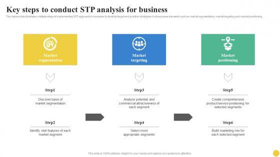 The below slide illustrates multiple steps of implementing STP approach in business to develop target and position strategies. It showcases elements such as market segmentation, market targeting and market positioning. Do you know about Slidesgeeks Key Steps To Conduct STP Analysis For Business User Segmentation Introduction Pdf These are perfect for delivering any kind od presentation. Using it, create PowerPoint presentations that communicate your ideas and engage audiences. Save time and effort by using our pre-designed presentation templates that are perfect for a wide range of topic. Our vast selection of designs covers a range of styles, from creative to business, and are all highly customizable and easy to edit. Download as a PowerPoint template or use them as Google Slides themes. The below slide illustrates multiple steps of implementing STP approach in business to develop target and position strategies. It showcases elements such as market segmentation, market targeting and market positioning.