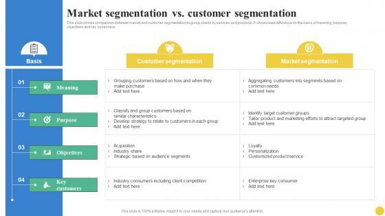 This slide shows comparison between market and customer segmentation to group clients by services and products. It showcases difference on the basis of meaning, purpose, objectives and key customers. Create an editable Market Segmentation Vs Customer Segmentation User Segmentation Download Pdf that communicates your idea and engages your audience. Whether you are presenting a business or an educational presentation, pre-designed presentation templates help save time. Market Segmentation Vs Customer Segmentation User Segmentation Download Pdf is highly customizable and very easy to edit, covering many different styles from creative to business presentations. Slidegeeks has creative team members who have crafted amazing templates. So, go and get them without any delay. This slide shows comparison between market and customer segmentation to group clients by services and products. It showcases difference on the basis of meaning, purpose, objectives and key customers.