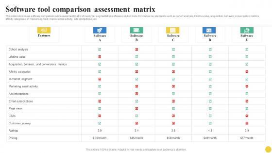This slide showcases software comparison and assessment matrix of customer segmentation software solution tools. It includes key elements such as cohort analysis, lifetime value, acquisition, behavior, conversation metrics, affinity categories, in market segment, market email activity, ads interactions, etc. If your project calls for a presentation, then Slidegeeks is your go-to partner because we have professionally designed, easy-to-edit templates that are perfect for any presentation. After downloading, you can easily edit Software Tool Comparison Assessment Matrix User Segmentation Pictures Pdf and make the changes accordingly. You can rearrange slides or fill them with different images. Check out all the handy templates This slide showcases software comparison and assessment matrix of customer segmentation software solution tools. It includes key elements such as cohort analysis, lifetime value, acquisition, behavior, conversation metrics, affinity categories, in market segment, market email activity, ads interactions, etc.