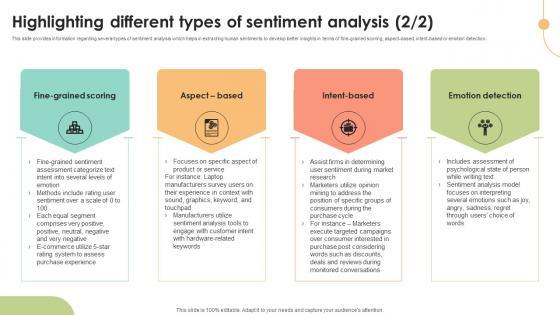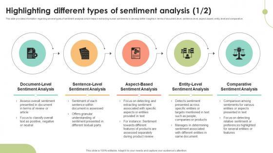 This slide provides information regarding several types of sentiment analysis which helps in extracting human sentiments to develop better insights in terms of document-level, sentence-level, aspect-based, entity-level and comparative. Explore a selection of the finest Highlighting Different Types Of Sentiment Decoding User Emotions In Depth Exploration AI SS V here. With a plethora of professionally designed and pre-made slide templates, you can quickly and easily find the right one for your upcoming presentation. You can use our Highlighting Different Types Of Sentiment Decoding User Emotions In Depth Exploration AI SS V to effectively convey your message to a wider audience. Slidegeeks has done a lot of research before preparing these presentation templates. The content can be personalized and the slides are highly editable. Grab templates today from Slidegeeks. This slide provides information regarding several types of sentiment analysis which helps in extracting human sentiments to develop better insights in terms of document-level, sentence-level, aspect-based, entity-level and comparative.