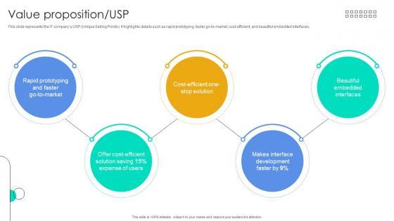This slide represents the IT companys USP Unique Selling Points. It highlights details such as rapid prototyping, faster go-to-market, cost-efficient, and beautiful embedded interfaces. Explore a selection of the finest Value Proposition Usp Function User Interface Service Investor Funding Elevator Pitch Deck here. With a plethora of professionally designed and pre-made slide templates, you can quickly and easily find the right one for your upcoming presentation. You can use our Value Proposition Usp Function User Interface Service Investor Funding Elevator Pitch Deck to effectively convey your message to a wider audience. Slidegeeks has done a lot of research before preparing these presentation templates. The content can be personalized and the slides are highly editable. Grab templates today from Slidegeeks. This slide represents the IT companys USP Unique Selling Points. It highlights details such as rapid prototyping, faster go-to-market, cost-efficient, and beautiful embedded interfaces.