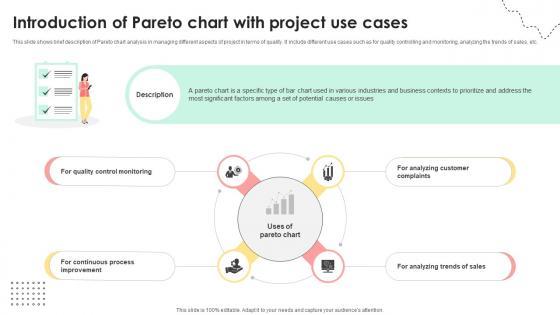 This slide shows brief description of Pareto chart analysis in managing different aspects of project in terms of quality. It include different use cases such as for quality controlling and monitoring, analyzing the trends of sales, etc. This Administering Quality Assurance Introduction Of Pareto Chart With Project Use Cases PM SS V is perfect for any presentation, be it in front of clients or colleagues. It is a versatile and stylish solution for organizing your meetings. The Administering Quality Assurance Introduction Of Pareto Chart With Project Use Cases PM SS V features a modern design for your presentation meetings. The adjustable and customizable slides provide unlimited possibilities for acing up your presentation. Slidegeeks has done all the homework before launching the product for you. So, do not wait, grab the presentation templates today This slide shows brief description of Pareto chart analysis in managing different aspects of project in terms of quality. It include different use cases such as for quality controlling and monitoring, analyzing the trends of sales, etc.
