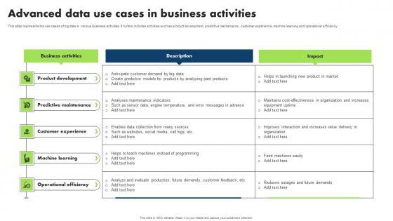 This slide represents the use cases of big data in various business activities. It further includes activities such as product development, predictive maintenance, customer experience, machine learning and operational efficiency Showcasing this set of slides titled Advanced Data Use Cases In Business Activities Slides Pdf. The topics addressed in these templates are Product Development, Predictive Maintenance, Customer Experience. All the content presented in this PPT design is completely editable. Download it and make adjustments in color, background, font etc. as per your unique business setting. This slide represents the use cases of big data in various business activities. It further includes activities such as product development, predictive maintenance, customer experience, machine learning and operational efficiency