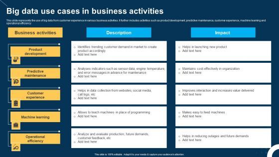 This slide represents the use of big data from customer experience in various business activities. It further includes activities such as product development, predictive maintenance, customer experience, machine learning and operational efficiency. Showcasing this set of slides titled Big Data Use Cases In Business Activities Ppt Model Deck pdf. The topics addressed in these templates are Predictive Maintenance, Customer Experience. All the content presented in this PPT design is completely editable. Download it and make adjustments in color, background, font etc. as per your unique business setting. This slide represents the use of big data from customer experience in various business activities. It further includes activities such as product development, predictive maintenance, customer experience, machine learning and operational efficiency.
