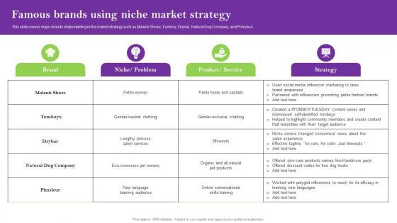 This slide covers major brands implementing niche market strategy such as Malenk Shoes, Tomboy, Drybar, Natural Dog Company, and Pimsleur. If you are looking for a format to display your unique thoughts, then the professionally designed Famous Brands Using Niche Market Sales Techniques For Achieving Introduction Pdf is the one for you. You can use it as a Google Slides template or a PowerPoint template. Incorporate impressive visuals, symbols, images, and other charts. Modify or reorganize the text boxes as you desire. Experiment with shade schemes and font pairings. Alter, share or cooperate with other people on your work. Download Famous Brands Using Niche Market Sales Techniques For Achieving Introduction Pdf and find out how to give a successful presentation. Present a perfect display to your team and make your presentation unforgettable. This slide covers major brands implementing niche market strategy such as Malenk Shoes, Tomboy, Drybar, Natural Dog Company, and Pimsleur.