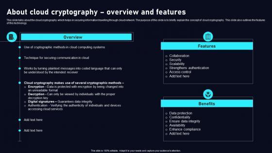This slide talks about the cloud cryptography which helps in securing information travelling through cloud network. The purpose of this slide is to briefly explain the concept of cloud cryptography. This slide also outlines the features of this technology. Present like a pro with About Cloud Cryptography Cloud Data Security Using Cryptography Mockup Pdf Create beautiful presentations together with your team, using our easy to use presentation slides. Share your ideas in real time and make changes on the fly by downloading our templates. So whether you are in the office, on the go, or in a remote location, you can stay in sync with your team and present your ideas with confidence. With Slidegeeks presentation got a whole lot easier. Grab these presentations today. This slide talks about the cloud cryptography which helps in securing information travelling through cloud network. The purpose of this slide is to briefly explain the concept of cloud cryptography. This slide also outlines the features of this technology.
