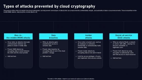 This purpose of this slide is to explain how cloud cryptography can help prevent several types of attacks that can compromise the confidentiality, integrity, and availability of data in cloud environments. These include Man in the middle MitM attacks, data breaches, insider attacks, etc. Make sure to capture your audiences attention in your business displays with our gratis customizable Types Of Attacks Prevented By Cloud Data Security Using Cryptography Guidelines Pdf. These are great for business strategies, office conferences, capital raising or task suggestions. If you desire to acquire more customers for your tech business and ensure they stay satisfied, create your own sales presentation with these plain slides. This purpose of this slide is to explain how cloud cryptography can help prevent several types of attacks that can compromise the confidentiality, integrity, and availability of data in cloud environments. These include Man in the middle MitM attacks, data breaches, insider attacks, etc.