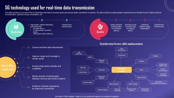 This slide provides an overview of the 5G technology that helps to increase speed and ensures better connectivity for working. The slide includes its implementation requirements and benefits that are it allows real-time communication, optimizes energy consumption, etc. Find a pre-designed and impeccable 5G Technology Used For Real IoT Fleet Monitoring Ppt PowerPoint IoT SS V. The templates can ace your presentation without additional effort. You can download these easy-to-edit presentation templates to make your presentation stand out from others. So, what are you waiting for Download the template from Slidegeeks today and give a unique touch to your presentation. This slide provides an overview of the 5G technology that helps to increase speed and ensures better connectivity for working. The slide includes its implementation requirements and benefits that are it allows real-time communication, optimizes energy consumption, etc.