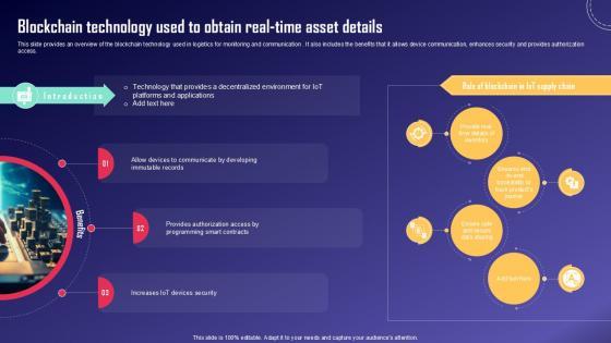 This slide provides an overview of the blockchain technology used in logistics for monitoring and communication . It also includes the benefits that it allows device communication, enhances security and provides authorization access. There are so many reasons you need a Blockchain Technology Used IoT Fleet Monitoring Ppt Example IoT SS V. The first reason is you can not spend time making everything from scratch, Thus, Slidegeeks has made presentation templates for you too. You can easily download these templates from our website easily. This slide provides an overview of the blockchain technology used in logistics for monitoring and communication . It also includes the benefits that it allows device communication, enhances security and provides authorization access.