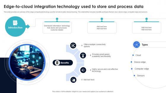 This slide provides an overview of the edge computing technology used for remote location device tracking. The slide further includes benefits and types that are clud, device edge, computer edge and sensors. This Optimization Of IoT Remote Monitoring Edge To Cloud Integration Technology Used To Store IoT SS V is perfect for any presentation, be it in front of clients or colleagues. It is a versatile and stylish solution for organizing your meetings. The Optimization Of IoT Remote Monitoring Edge To Cloud Integration Technology Used To Store IoT SS V features a modern design for your presentation meetings. The adjustable and customizable slides provide unlimited possibilities for acing up your presentation. Slidegeeks has done all the homework before launching the product for you. So, do not wait, grab the presentation templates today This slide provides an overview of the edge computing technology used for remote location device tracking. The slide further includes benefits and types that are clud, device edge, computer edge and sensors.