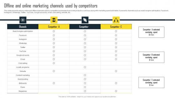 This slide presents various online and offline channels used by competitor businesses to promote products or services along with marketing spend estimation. It presents channels such as search engine optimization, Facebook, Instagram, WhatsApp, Twitter, YouTube, Google ad words, email, cold calling, website, etc. Slidegeeks is one of the best resources for PowerPoint templates. You can download easily and regulate Offline And Online Marketing Channels Used Efficient Plan For Conducting Competitor Elements Pdf for your personal presentations from our wonderful collection. A few clicks is all it takes to discover and get the most relevant and appropriate templates. Use our Templates to add a unique zing and appeal to your presentation and meetings. All the slides are easy to edit and you can use them even for advertisement purposes. This slide presents various online and offline channels used by competitor businesses to promote products or services along with marketing spend estimation. It presents channels such as search engine optimization, Facebook, Instagram, WhatsApp, Twitter, YouTube, Google ad words, email, cold calling, website, etc.