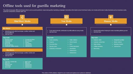 This slide showcases offline techniques which can be used to perfectly implement guerilla marketing campaigns. It provides information about minimaxi media, non media and human media channels such as business cards, customer contact time, elevator pitch, etc. Welcome to our selection of the Strategic Guide To Attract Offline Tools Used For Guerilla Marketing Template Pdf. These are designed to help you showcase your creativity and bring your sphere to life. Planning and Innovation are essential for any business that is just starting out. This collection contains the designs that you need for your everyday presentations. All of our PowerPoints are 100 percent editable, so you can customize them to suit your needs. This multi-purpose template can be used in various situations. Grab these presentation templates today. This slide showcases offline techniques which can be used to perfectly implement guerilla marketing campaigns. It provides information about minimaxi media, non media and human media channels such as business cards, customer contact time, elevator pitch, etc.