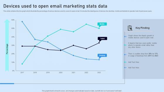 This slide contains the line graph which illustrate the percentage of various devices used by users to open email. It includes the data figures of devices like desktop, mobile and tablets to operate mail of past seven years. Pitch your topic with ease and precision using this Devices Used To Open Email Marketing Stats Data Brochure Pdf. This layout presents information on Key Finding, Stats Data, Devices. It is also available for immediate download and adjustment. So, changes can be made in the color, design, graphics or any other component to create a unique layout. This slide contains the line graph which illustrate the percentage of various devices used by users to open email. It includes the data figures of devices like desktop, mobile and tablets to operate mail of past seven years.