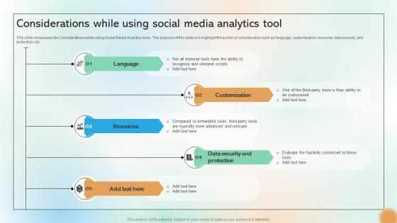 This slide showcases the Considerations while using Social Media Analytics tools. The purpose of this slide is to highlight the points of consideration such as language, customization, recourse, data security, and protection, etc. From laying roadmaps to briefing everything in detail, our templates are perfect for you. You can set the stage with your presentation slides. All you have to do is download these easy-to-edit and customizable templates. Considerations While Using Social Media Analytics Tool Cracking The Code Of Social Media will help you deliver an outstanding performance that everyone would remember and praise you for. Do download this presentation today. This slide showcases the Considerations while using Social Media Analytics tools. The purpose of this slide is to highlight the points of consideration such as language, customization, recourse, data security, and protection, etc.