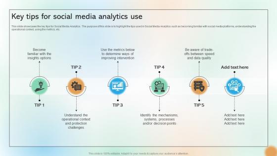This slide showcases the key tips for Social Media Analytics. The purpose of this slide is to highlight the tips used in Social Media Analytics such as becoming familiar with social media platforms, understanding the operational context, using the metrics, etc. Find a pre-designed and impeccable Key Tips For Social Media Analytics Use Cracking The Code Of Social Media. The templates can ace your presentation without additional effort. You can download these easy-to-edit presentation templates to make your presentation stand out from others. So, what are you waiting for Download the template from Slidegeeks today and give a unique touch to your presentation. This slide showcases the key tips for Social Media Analytics. The purpose of this slide is to highlight the tips used in Social Media Analytics such as becoming familiar with social media platforms, understanding the operational context, using the metrics, etc.