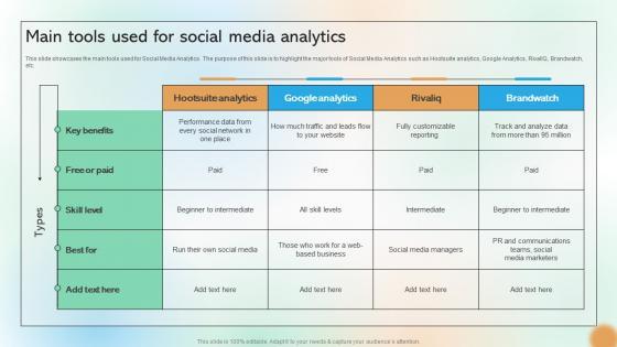 This slide showcases the main tools used for Social Media Analytics. The purpose of this slide is to highlight the major tools of Social Media Analytics such as Hootsuite analytics, Google Analytics, RivalIQ, Brandwatch, etc. Create an editable Main Tools Used For Social Media Analytics Cracking The Code Of Social Media that communicates your idea and engages your audience. Whether you are presenting a business or an educational presentation, pre-designed presentation templates help save time. Main Tools Used For Social Media Analytics Cracking The Code Of Social Media is highly customizable and very easy to edit, covering many different styles from creative to business presentations. Slidegeeks has creative team members who have crafted amazing templates. So, go and get them without any delay. This slide showcases the main tools used for Social Media Analytics. The purpose of this slide is to highlight the major tools of Social Media Analytics such as Hootsuite analytics, Google Analytics, RivalIQ, Brandwatch, etc.