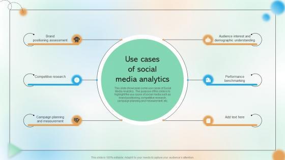 This slide showcases some use cases of Social Media Analytics. The purpose of this slide is to highlight the use cases of social media such as brand positioning, competitive research, campaign planning and measurement, etc. Create an editable Use Cases Of Social Media Analytics Cracking The Code Of Social Media that communicates your idea and engages your audience. Whether you are presenting a business or an educational presentation, pre-designed presentation templates help save time. Use Cases Of Social Media Analytics Cracking The Code Of Social Media is highly customizable and very easy to edit, covering many different styles from creative to business presentations. Slidegeeks has creative team members who have crafted amazing templates. So, go and get them without any delay. This slide showcases some use cases of Social Media Analytics. The purpose of this slide is to highlight the use cases of social media such as brand positioning, competitive research, campaign planning and measurement, etc.