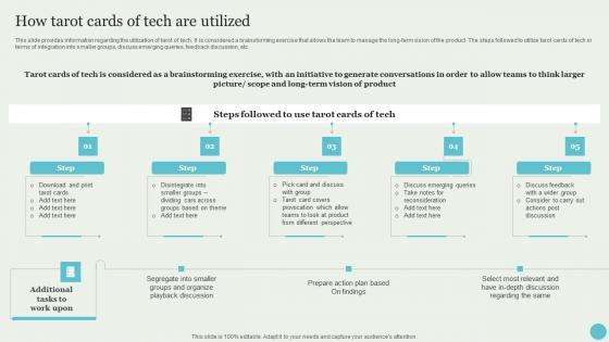 This slide provides information regarding the utilization of tarot of tech. It is considered a brainstorming exercise that allows the team to manage the long-term vision of the product. The steps followed to utilize tarot cards of tech in terms of integration into smaller groups, discuss emerging queries, feedback discussion, etc. This How Tarot Cards Of Tech Are Utilized Crafting A Sustainable Company Information Pdf is perfect for any presentation, be it in front of clients or colleagues. It is a versatile and stylish solution for organizing your meetings. The How Tarot Cards Of Tech Are Utilized Crafting A Sustainable Company Information Pdf features a modern design for your presentation meetings. The adjustable and customizable slides provide unlimited possibilities for acing up your presentation. Slidegeeks has done all the homework before launching the product for you. So, do not wait, grab the presentation templates today This slide provides information regarding the utilization of tarot of tech. It is considered a brainstorming exercise that allows the team to manage the long-term vision of the product. The steps followed to utilize tarot cards of tech in terms of integration into smaller groups, discuss emerging queries, feedback discussion, etc.
