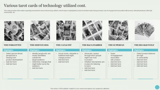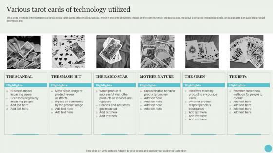 This slide provides information regarding several tarot cards of technology utilized, which helps in highlighting impact on the community by product usage, negative scenarios impacting people, unsustainable behavior that product promotes, etc. Whether you have daily or monthly meetings, a brilliant presentation is necessary. Various Tarot Cards Of Technology Utilized Crafting A Sustainable Company Background Pdf can be your best option for delivering a presentation. Represent everything in detail using Various Tarot Cards Of Technology Utilized Crafting A Sustainable Company Background Pdf and make yourself stand out in meetings. The template is versatile and follows a structure that will cater to your requirements. All the templates prepared by Slidegeeks are easy to download and edit. Our research experts have taken care of the corporate themes as well. So, give it a try and see the results. This slide provides information regarding several tarot cards of technology utilized, which helps in highlighting impact on the community by product usage, negative scenarios impacting people, unsustainable behavior that product promotes, etc.